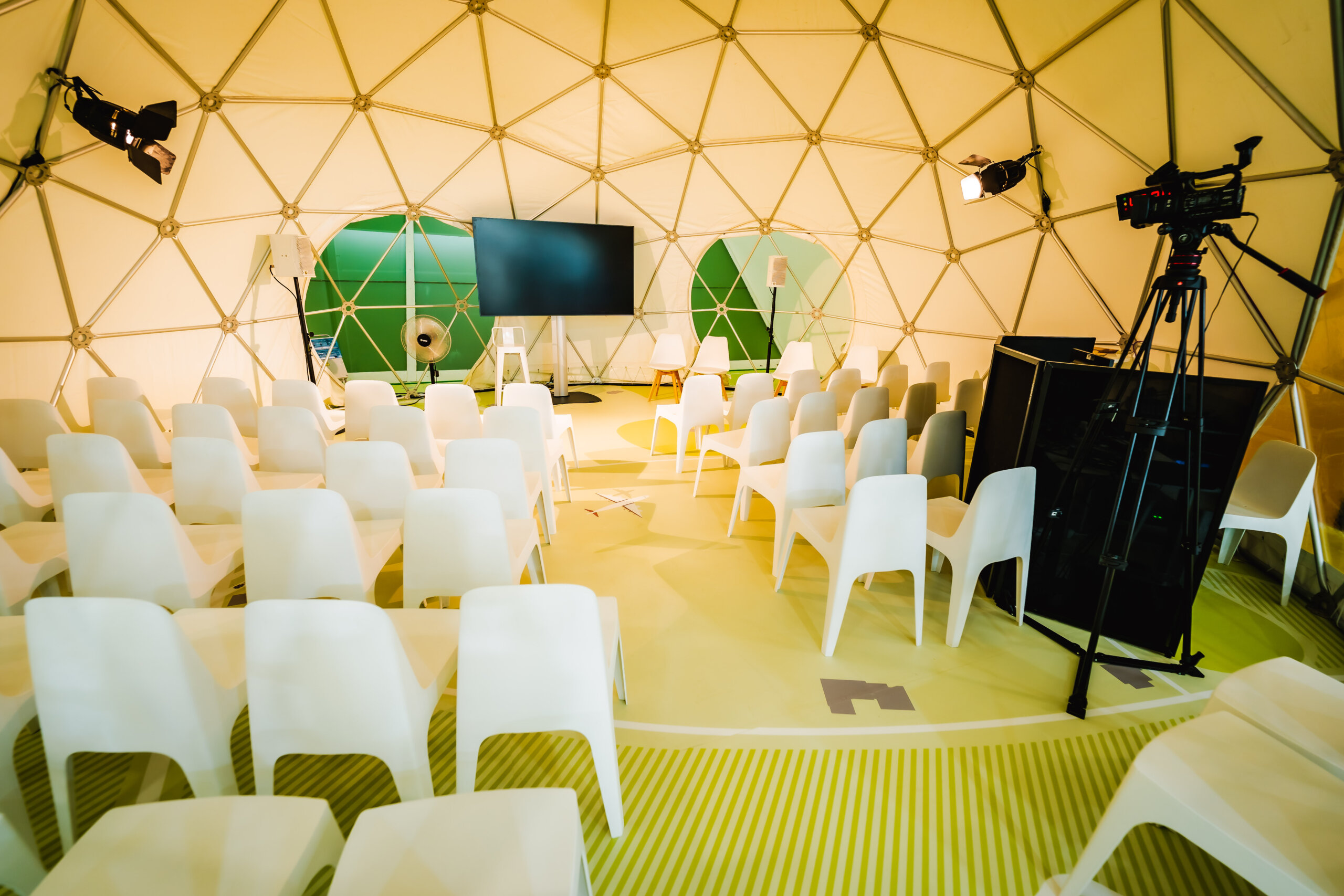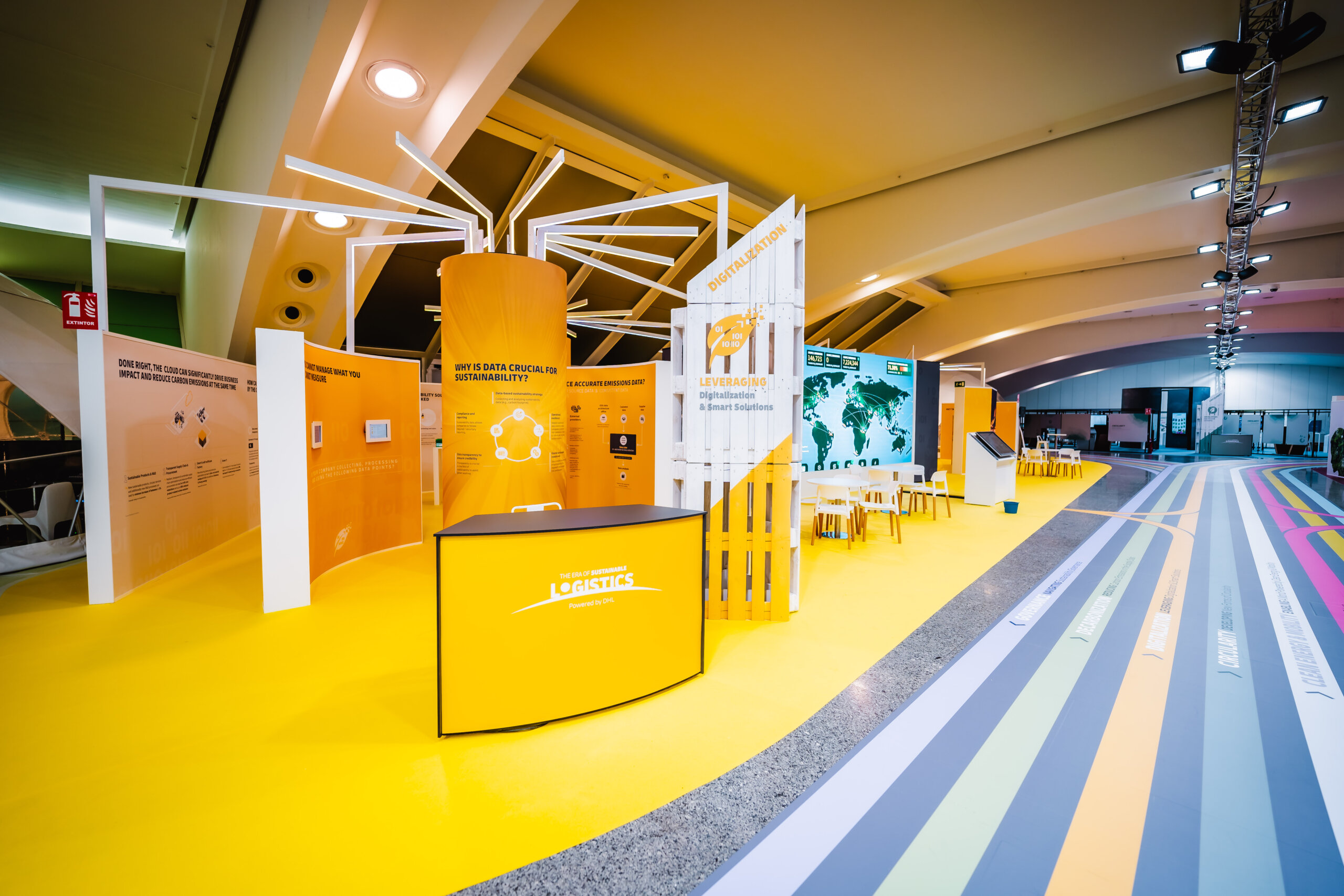 La arquitectura efímera se integró con la estética del entorno, potenciando la identidad de marca de DHL con un lenguaje visual sostenible y coherente: materiales reciclables, iluminación eficiente y un flujo espacial diseñado para fomentar el diálogo y la inspiración colectiva.